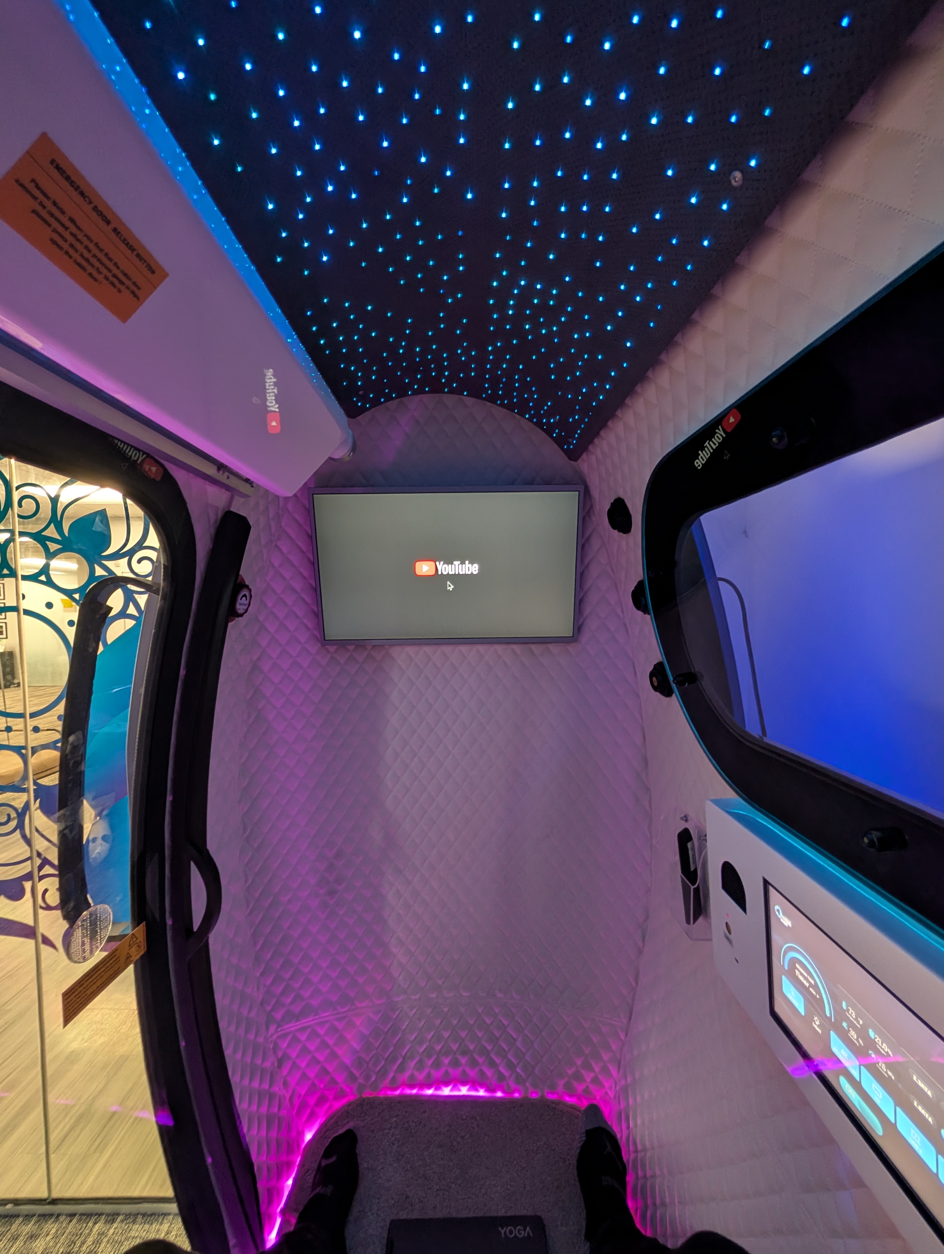 At Mind Spa, we use a 2.0 ATA hard sided flow chamber that is designed to combine clinical level pressure with a safer internal environment for patients. The chamber is pressurized with ambient room air, while concentrated oxygen is delivered through a mask. Because the air inside the chamber is constantly exchanged, the overall oxygen concentration in the chamber remains below 25 percent, which remains within commonly cited safety thresholds for fire risk and allows us to support controlled use of personal electronics under our protocols.